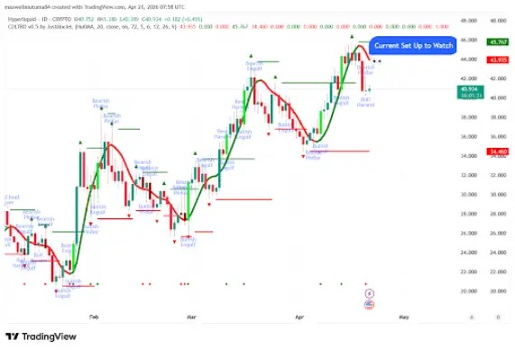 According to TradingView technical analysis, Hyperliquid price posted a series of strong rallies from late January through mid-April on the daily setup. Each upward leg then gave way to a pullback after bearish reversal candles appeared near local highs. That sequence appeared in early February, mid-March, and again after the latest April surge.