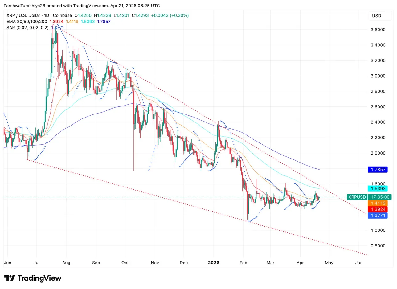 The descending channel from the August peak near $3.60 remains the long-term structure. Within it, the picture has shifted. The 20-day EMA at $1.3924, 50-day at $1.4119, and SAR at $1.3771 have all crossed below price and now sit as support. The 100-day at $1.5393 is the next resistance above, with the 200-day at $1.7857 and the channel boundary beyond that.