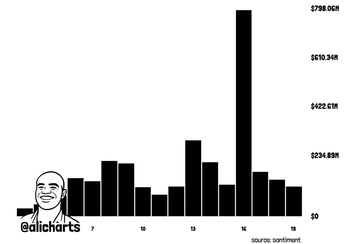 As per Ali Martinez, $DOGE saw its biggest transaction volume spike of the year on the 16th of April, of about $800 million.