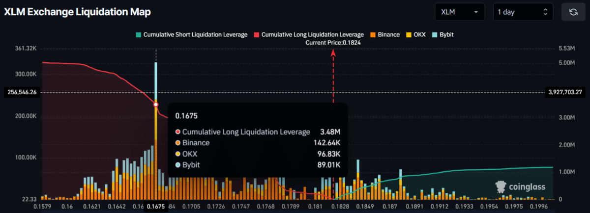 Data from the $XLM exchange liquidation map shows that traders are over-leveraged at $0.1675 on the lower side and $0.1879 on the upper side.
