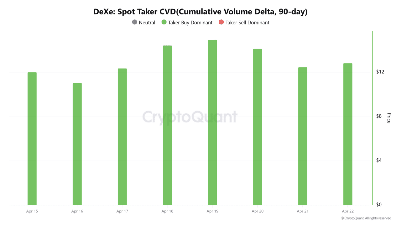 $DEXE whales have remained active on the spot and are actively buying. The Spot Average Order Size data from CryptoQuant showed an increase in large whale orders around $12.