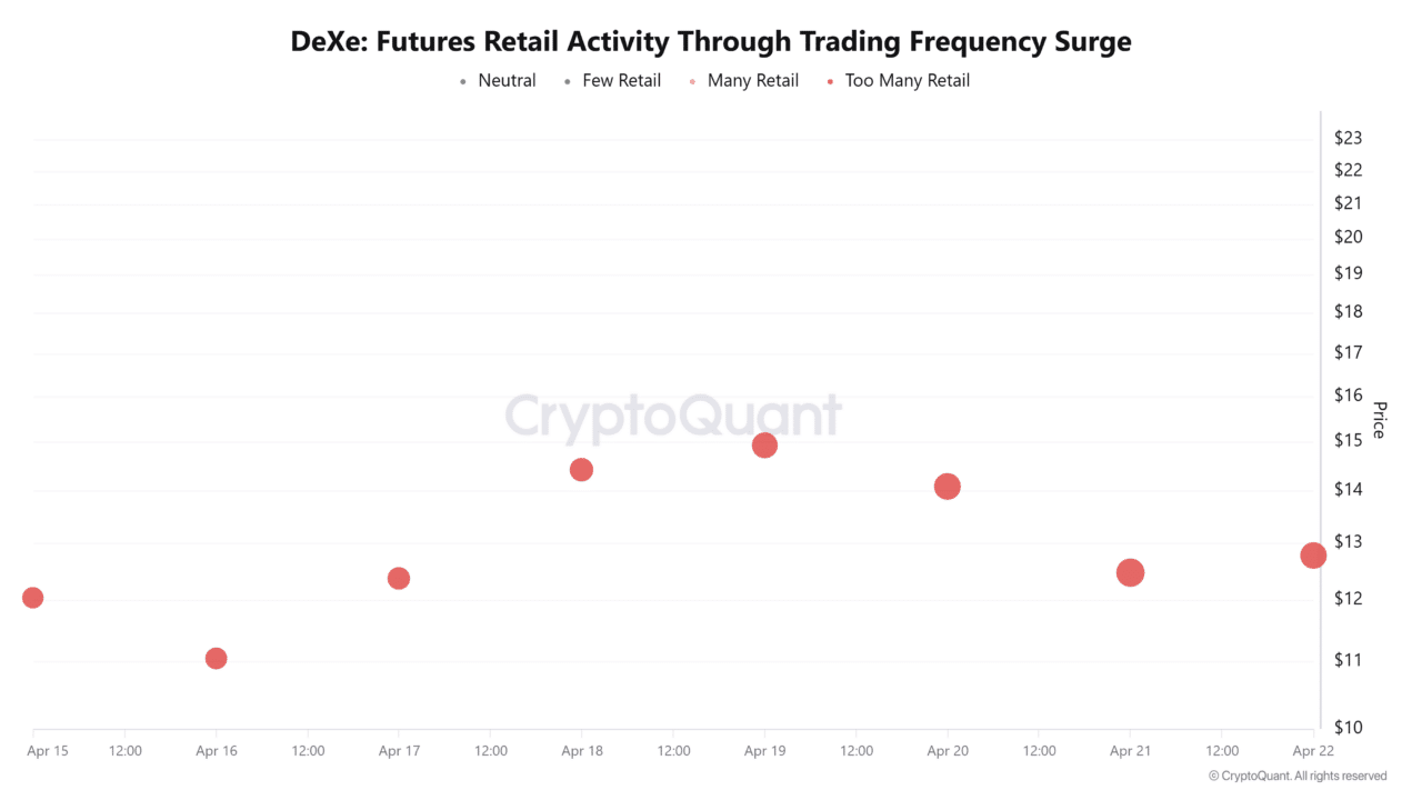 After $DEXE rallied to $16.2, Futures Retail Trading Activity data from CryptoQuant showed excessive retail orders.