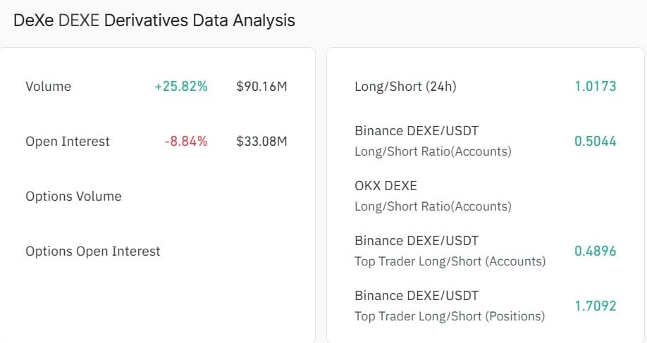 Thus, significant capital flowed out of Futures positions. In fact, over the past 24 hours, $DEXE Futures saw $30.56 million in outflows compared to $29 million in inflows.