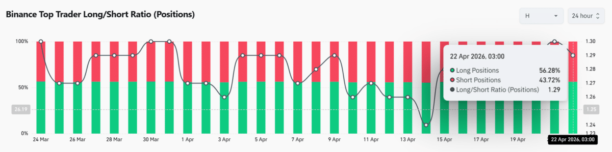 Binance top traders increased long exposure, with 56.28% of positions held long against 43.72% short, pushing the long/short ratio to 1.29.