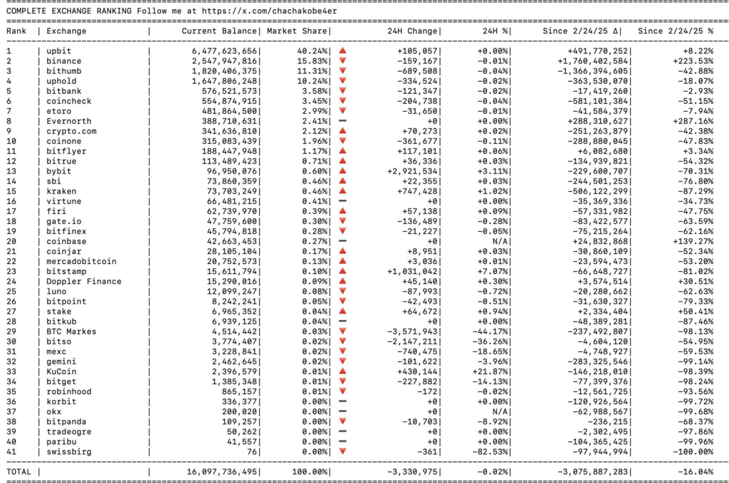 Since February 24, 2025, the available supply of $XRP on 41 cryptocurrency exchanges has declined by more than 3 billion tokens, reaching roughly 16 billion at press time, according to on-chain data from X user @Chachakobe4er. As such, the sellable supply of this token on 41 crypto exchanges dropped by 16% during this period.