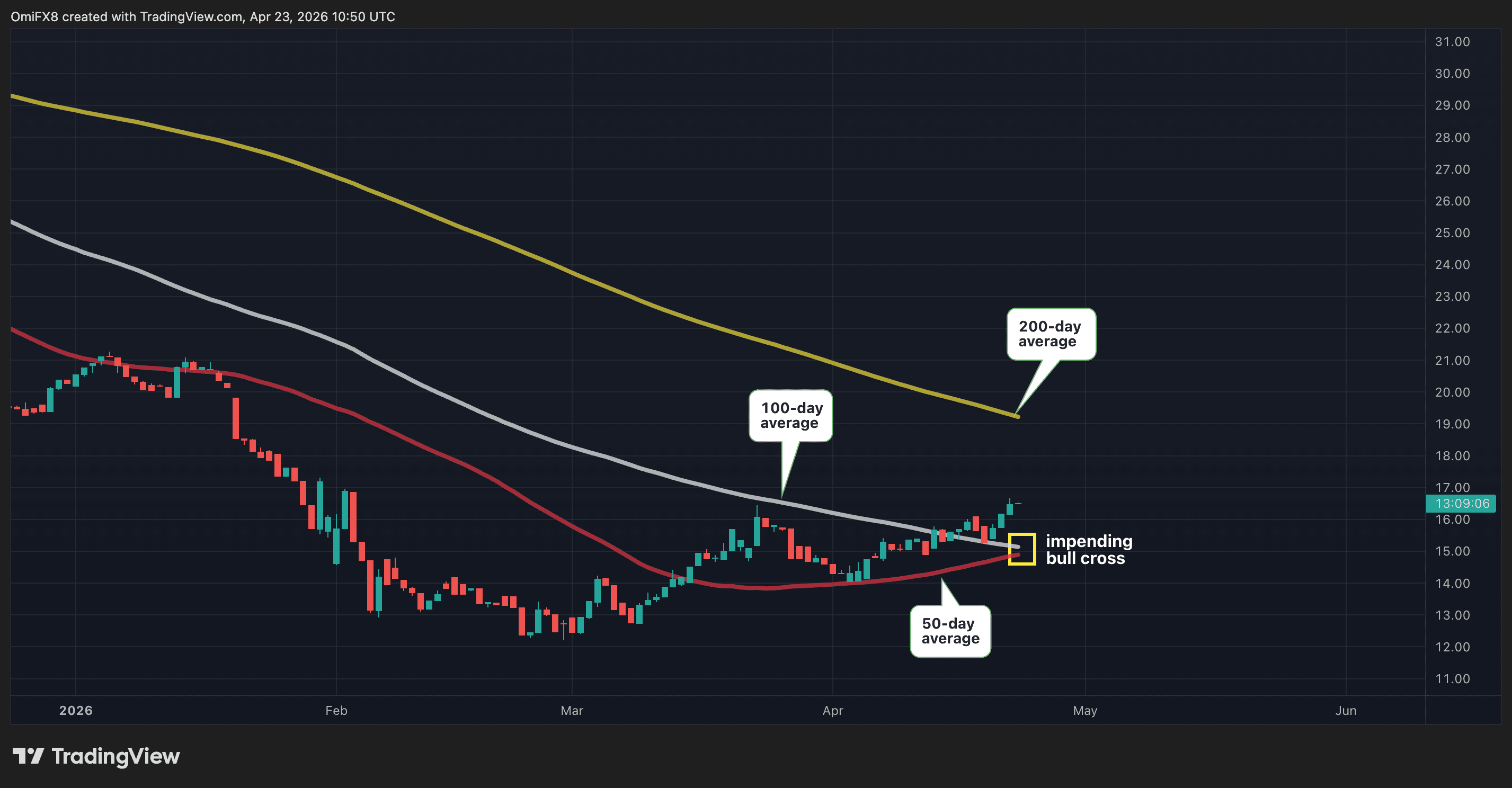 The chart shows fluctuations in the ratio between bitcoin’s price and gold, displayed in candlestick format. The red line represents the 50-day moving average, the white line the 100-day moving average and the yellow line the 200-day moving average.