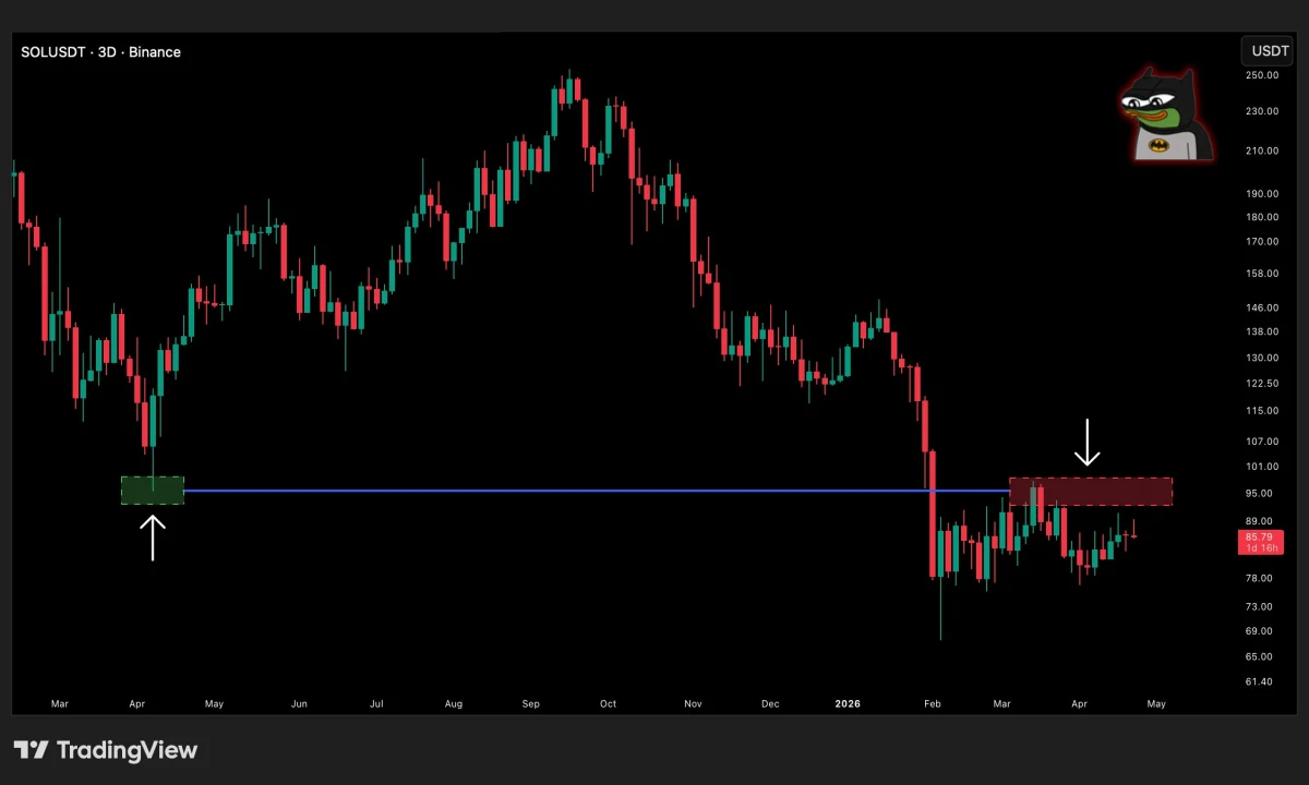 Additionally, Solana struggles to match the strength of other large-cap cryptocurrencies. Price remains below a major resistance zone between $95 and $100. This level previously acted as support, which now reinforces its role as resistance.