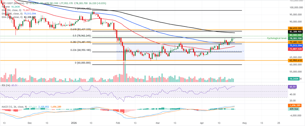 On the topside, initial resistance lies at the 50% Fibonacci retracement at $78,962, followed by the psychological $80,000 barrier; a sustained break above these levels would expose the 200-day EMA near $82,309 and then the 61.8% retracement at around $83,437, ahead of the stronger horizontal cap at $84,410.