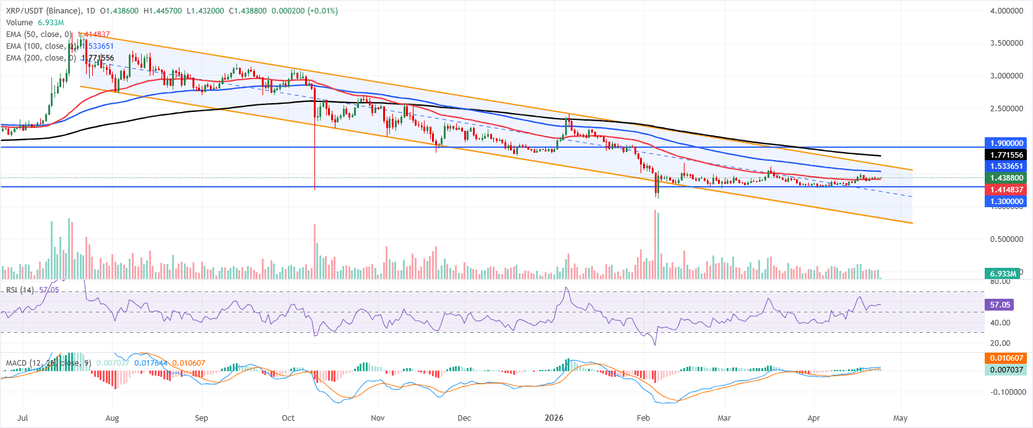 $XRP price is trading at $1.43 on Friday, holds above the 50-day EMA at $1.41, hinting at a mildly constructive near-term tone, but remains capped beneath the 100-day EMA at $1.53 and well under the 200-day EMA at $1.77, which keeps the broader trend constrained inside the prevailing downward parallel channel.