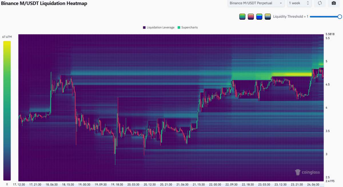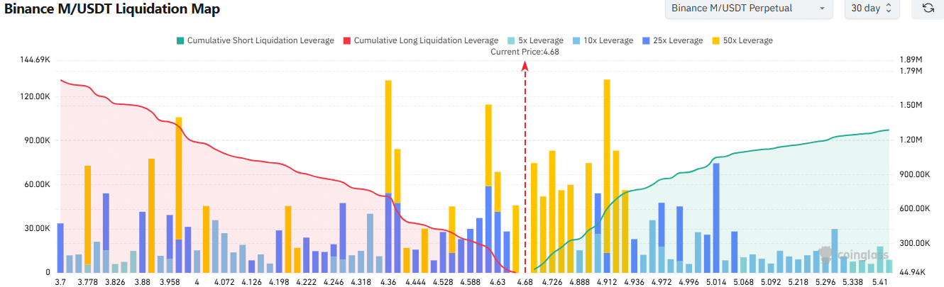 The liquidation map showed that the short liquidations from $4.72 to $4.93 had a greater cumulative liquidation leverage. This meant that it was more likely that M would climb higher than fall toward the $4.36-$4.53 area.