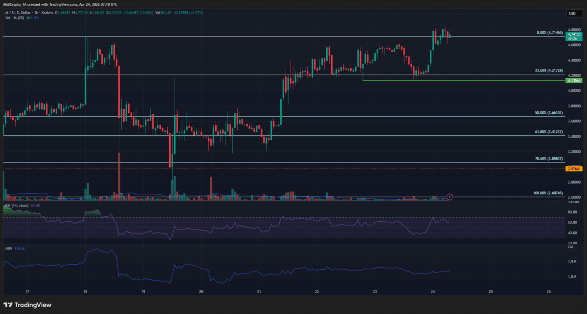 On the other hand, the token faced closer scrutiny. Crypto sleuth ZachXBT’s statement that M was one of the altcoins with “highly questionable price action” could strain bullish confidence.
