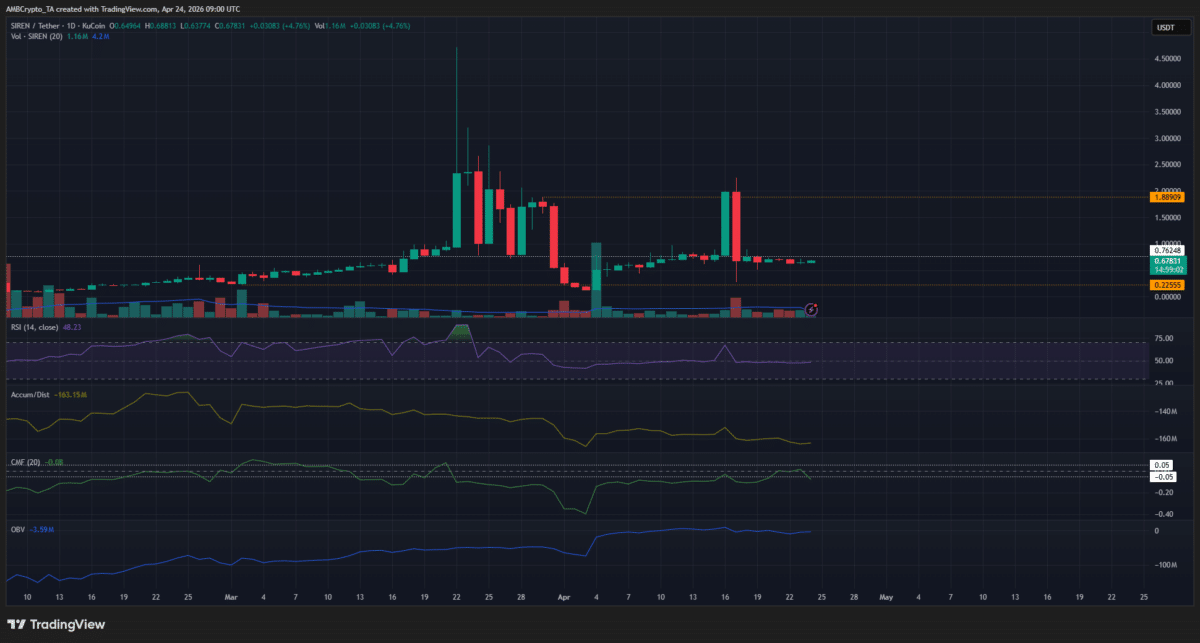 Siren [$SIREN] exhibited high volatility last week. A rally beyond $2 on the 16th of April was followed by a bearish engulfing candle pattern that took $SIREN prices back below $0.762.
