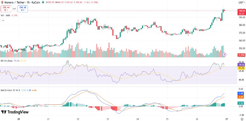 At the time of writing this, Monero$XMR4.14% is trading at around $398.49 with a surge of around 5%, according to CoinMarketCap. The privacy coin holds an impressive market capitalization of around $7.35 billion, and the daily trading volume revolves around $109.42 million.