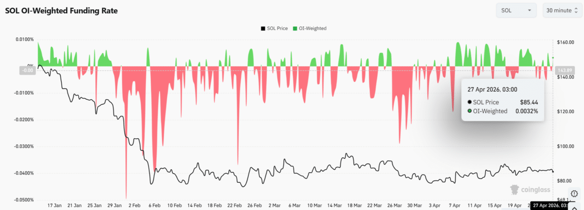 Derivative data showed a shift in positioning, as the OI-Weighted Funding Rate turned positive to approximately 0.0032% as of writing. This shift indicated that long traders had started paying short traders, reflecting a growing bias toward bullish positioning.