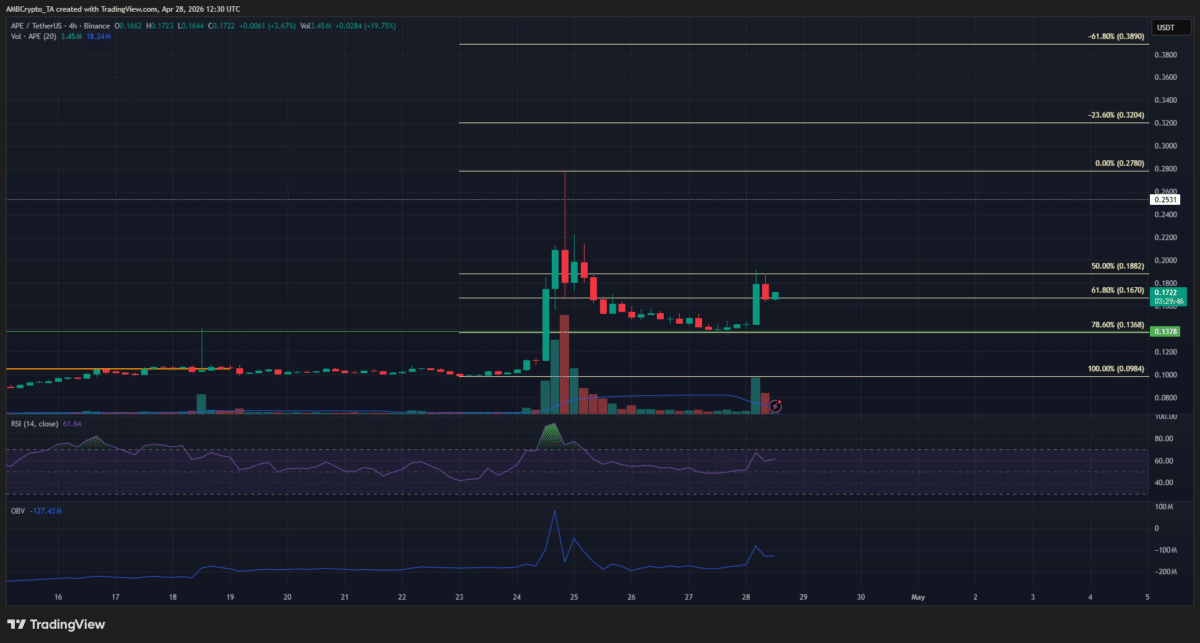 On Friday, the 24th of April, $APE rallied by 174.4% within 20 hours. The move spanned from $0.101 to $0.278. Since making this local peak, $APE retraced 50.3% over the weekend to reach the $0.138 support on Monday, the 27th of April.