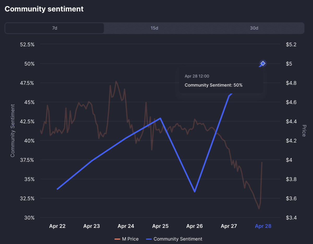 Price action shows that M’s decline began on the 24th of April after testing the upper band. At the time of writing, the asset traded near the middle band, which can function as either support or resistance.