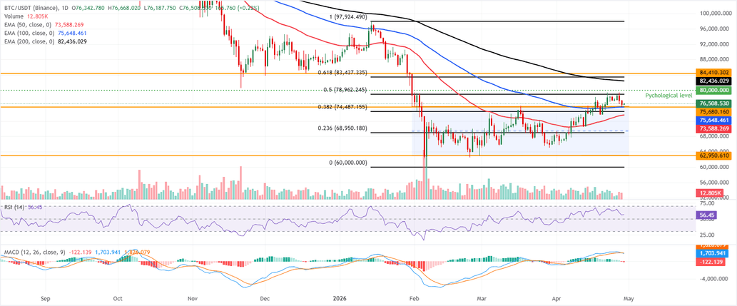 Bitcoin price is trading at $76,508 on Wednesday, holding a constructive bullish bias as it sits above the 50-day and 100-day Exponential Moving Averages (EMAs) at roughly $73,588 and $75,648, and has also pushed above the upper boundary of the parallel channel near $75,680.