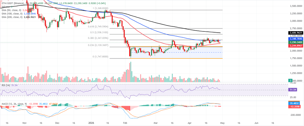 Ethereum is trading at $2,290 on Wednesday, maintaining a neutral-to-slightly bullish tone as it stays above the 50-day EMA at $2,244 while still trading beneath the 100-day EMA at $2,348. This configuration suggests the shorter-term trend supports the recent rebound, but the broader recovery remains capped by medium-term resistance.