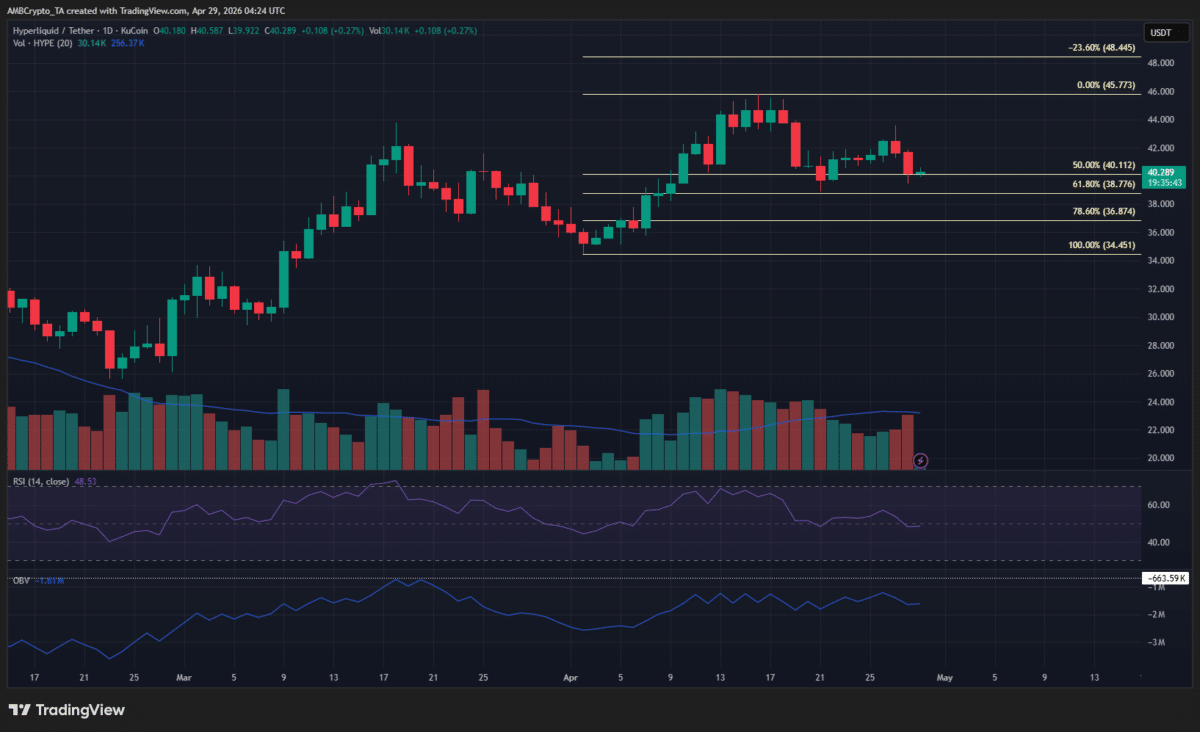 At the time of writing, the 1-day structure appeared to be bullish. The most recent structure break in favor of the buyers came on Monday, 13 April, when $HYPE broke the previous swing high at $43.76.
