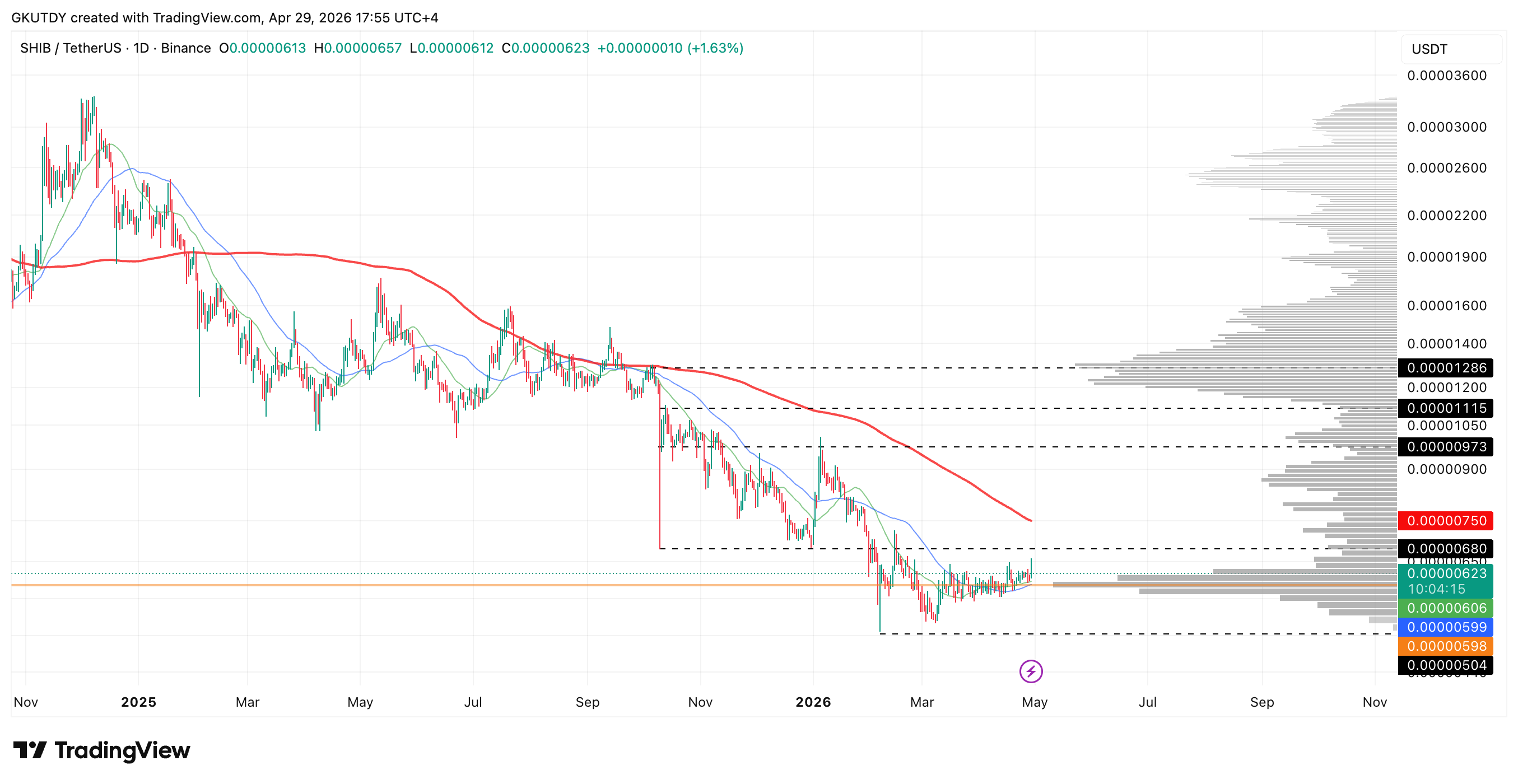 December 2024 marked the last significant peak for $SHIB at $0.00003366, after which the meme coin entered a deep drop, losing 84% of its value. However, spring 2026 has brought local optimism. Since March, the price has already shown a 20% increase, rising to $0.00000628.