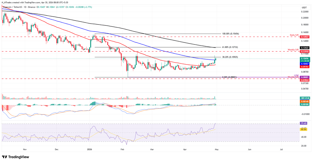 Dogecoin's price is extending its gains, trading above $0.106 on Wednesday and surpassing the key 100-day Exponential Moving Average (EMA) at $0.104.