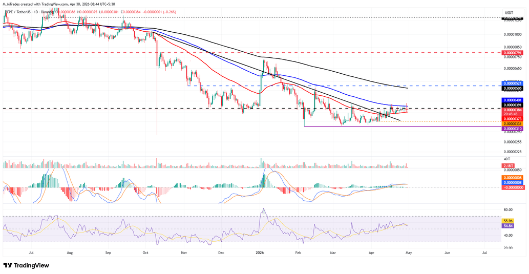 On the other hand, if $PEPE pulls back and closes below the 50-day EMA at $0.0000037, it could extend the decline toward the April 7 low at $0.0000033.