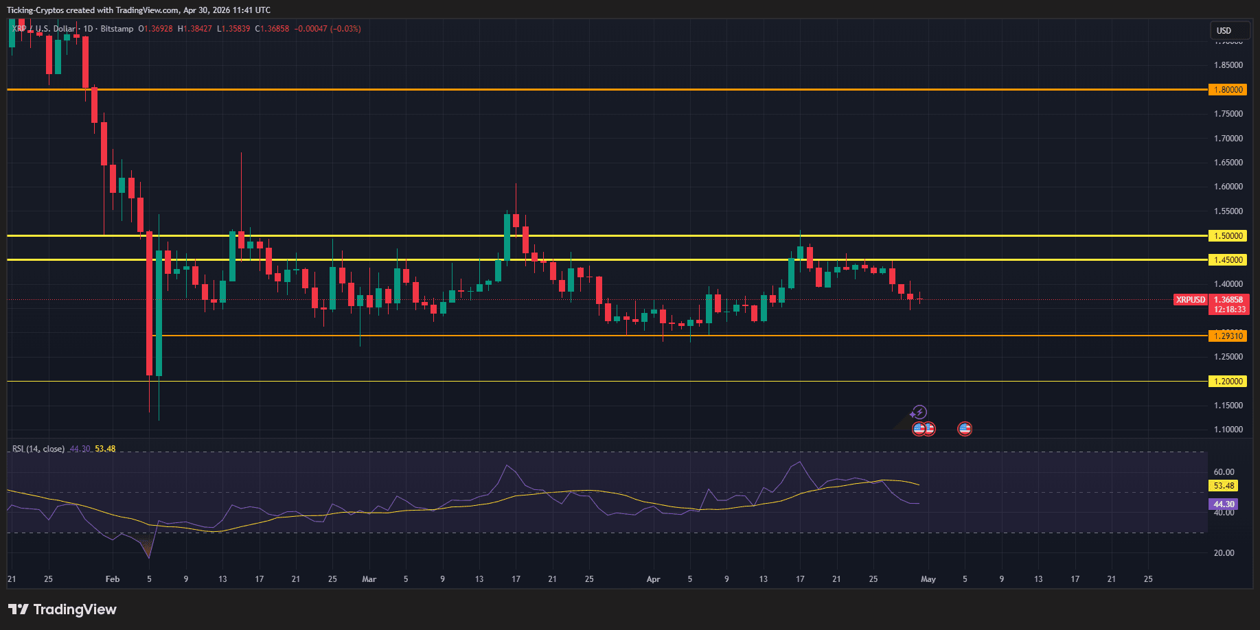 - Intermediate Resistance ($1.4500 - $1.5000): $XRP has struggled to maintain candles above the $1.45 mark. This zone acted as a rejection point in mid-April.