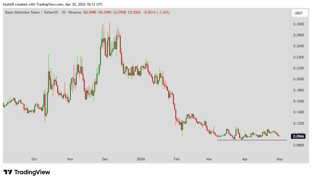 CoinMarketCap data shows $BAT price hovers around $0.096, down 2.6% in the past 24 hours and 4% this past week.