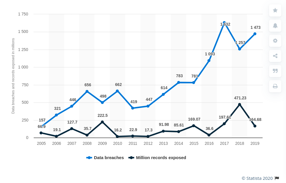Annual data breaches and exposed records in the US from 2005-2019 (Source: Statista.com)
