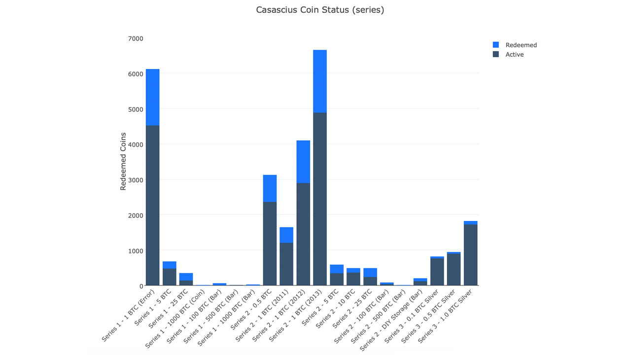 Caldwell also minted a number of 1,000 BTC bars and so far, most of those have been redeemed. The series one 1,000 BTC bar data shows that 87% have been redeemed. The series two Casascius bars only stored 500 BTC and every single one of those bars have been peeled.