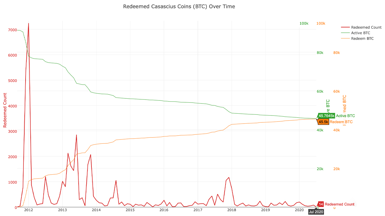 On July 12, 2020, there’s only 45,760 active BTC held on Casascius physical coins or bars in existence, as there were roughly 46,320 active BTC coins in December 2019. That means at today’s BTC/USD exchange rates out of the 560 coins redeemed, $5.1 million in BTC was spent.