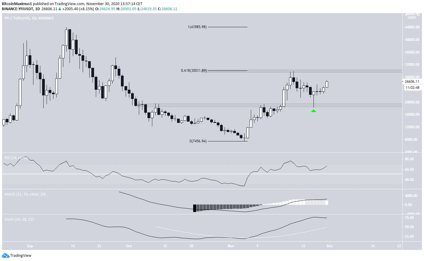 The YFI price reached a high of $29,890 on Nov. 20 before dropping sharply. On Nov. 26, the price re-tested the $19,000 support area with a long hammer candlestick and has been increasing since.