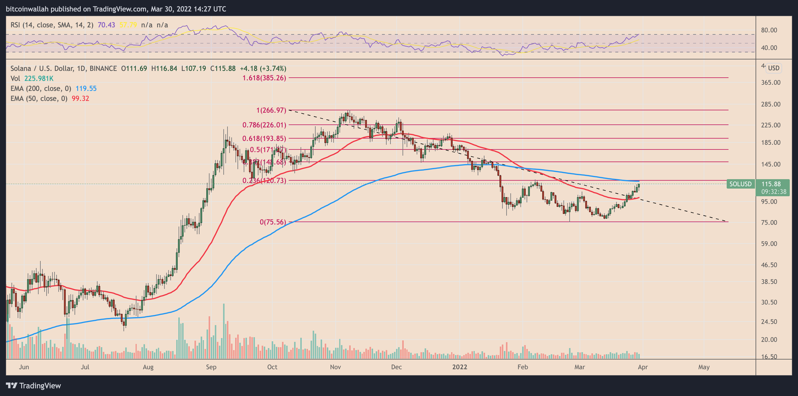 Solana (SOL) continued its two-week uptrend on March 30, rising in part owing to its integration with OpenSea, the world's biggest nonfungible token (NFT) by volume.
