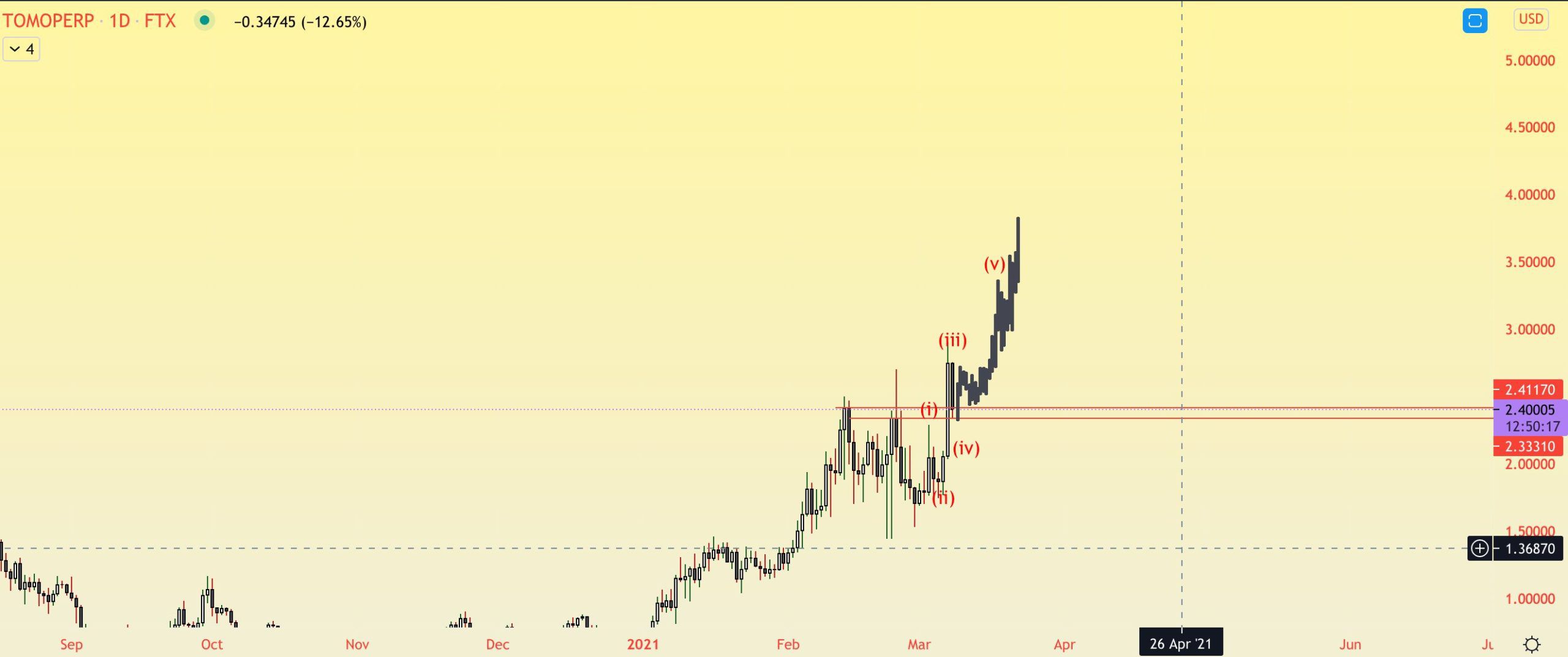 To conclude, TOMO/USD is likely in the final portion of its upward movement. While this increase may extend, TOMO/USD is likely to close to reaching its local top.