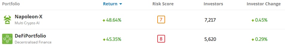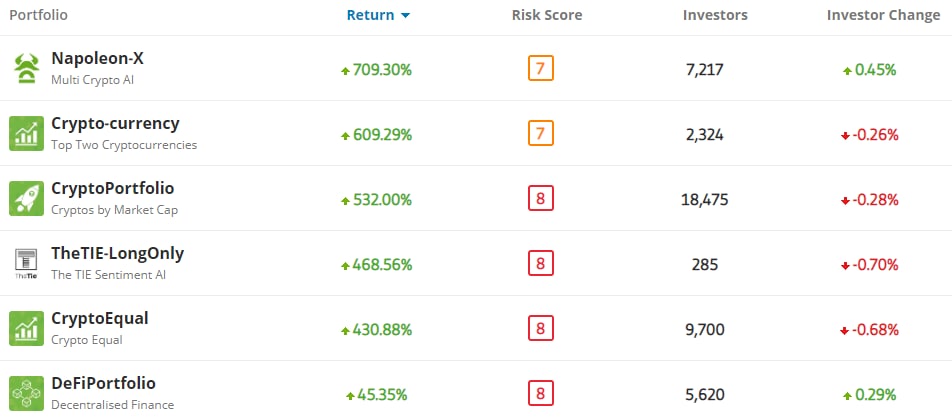 On a two-year time scale, several of the eToro portfolios have offered returns in excess of 430% including Napoleon-X, which has experienced an increase of 709.3%. During that same time period, the total crypto market cap has increased 808%, while the price of BTC has increased by 472%.