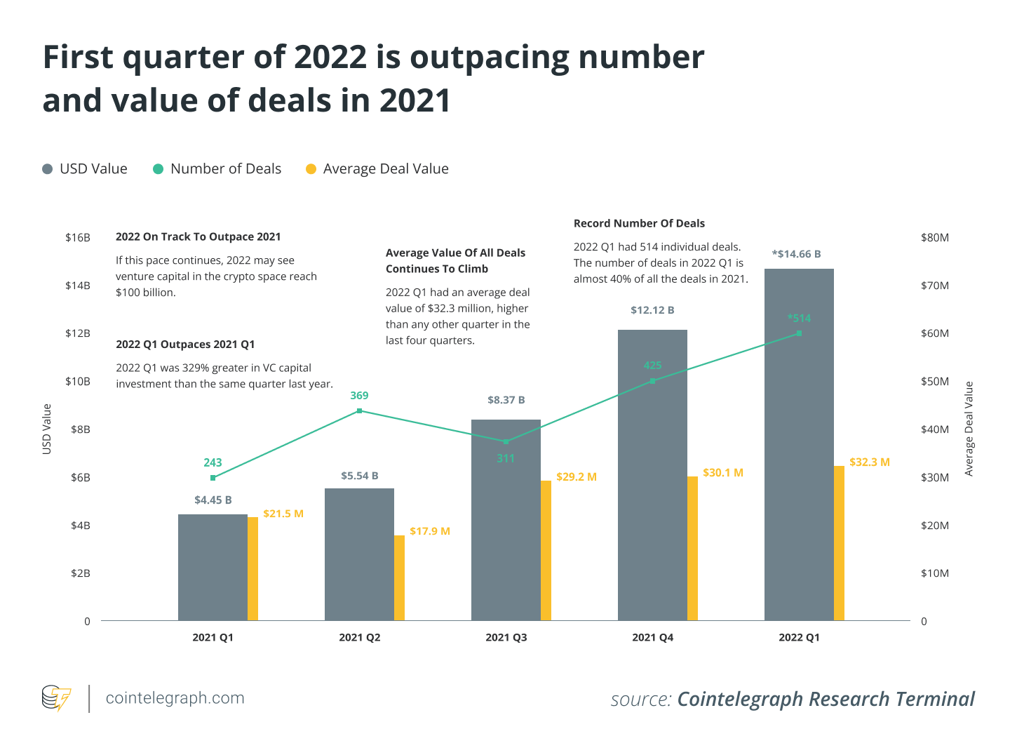 The first quarter of 2022 saw an unprecedented amount of capital inflows in the blockchain industry. Since the start of 2021, each quarter has continuously increased the total capital invested in this space, culminating in the 2022 Q1 that ushered in over $14.6 billion in VC investment. The average United States dollar value of each deal has also increased and now stands around $32.3 million for the last three months.