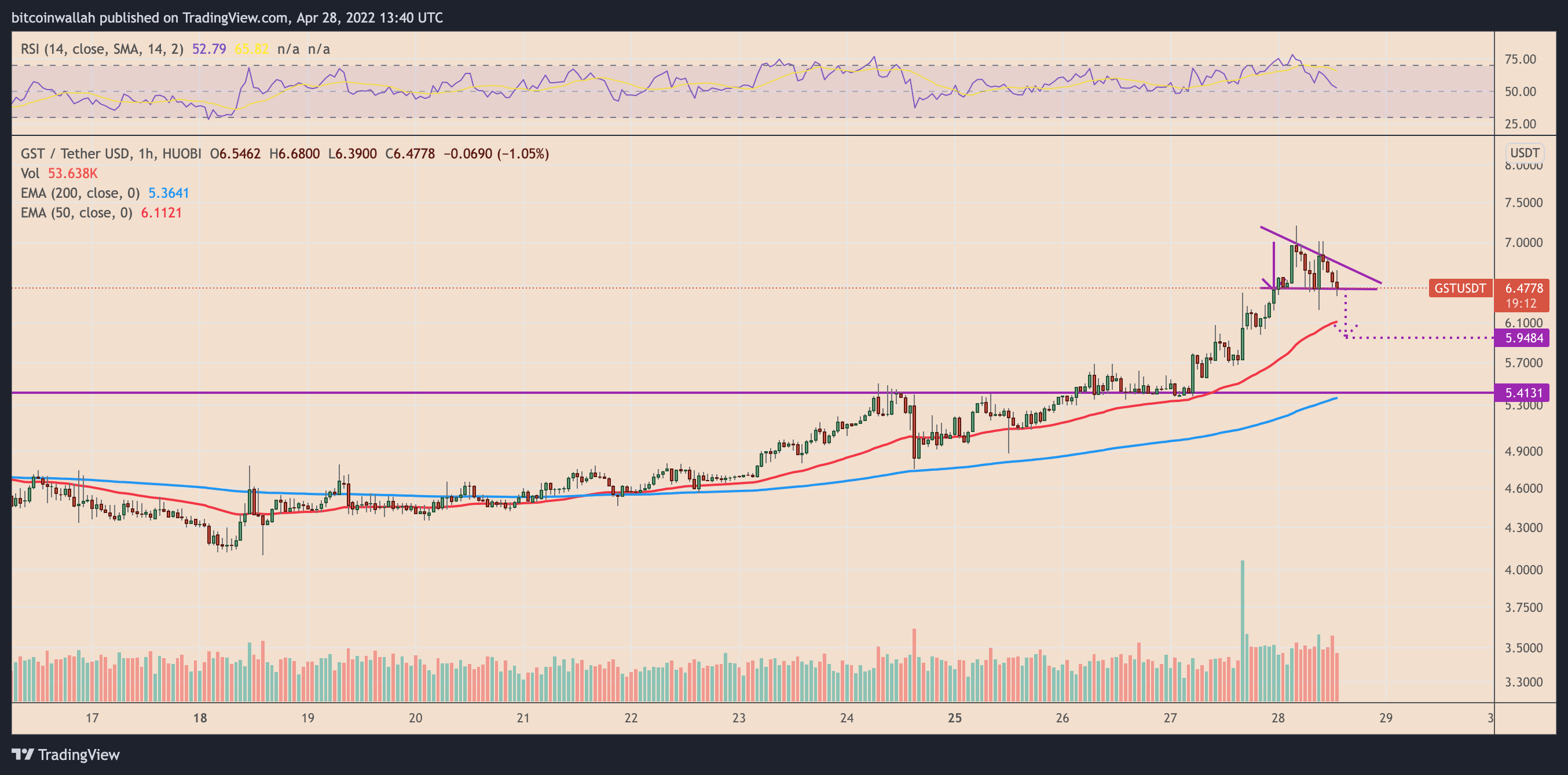 GMT's price eyes a return to $4.50 ahead of this week's close, based on the "ascending triangle" setup on its shorter-timeframe charts, as shown below.