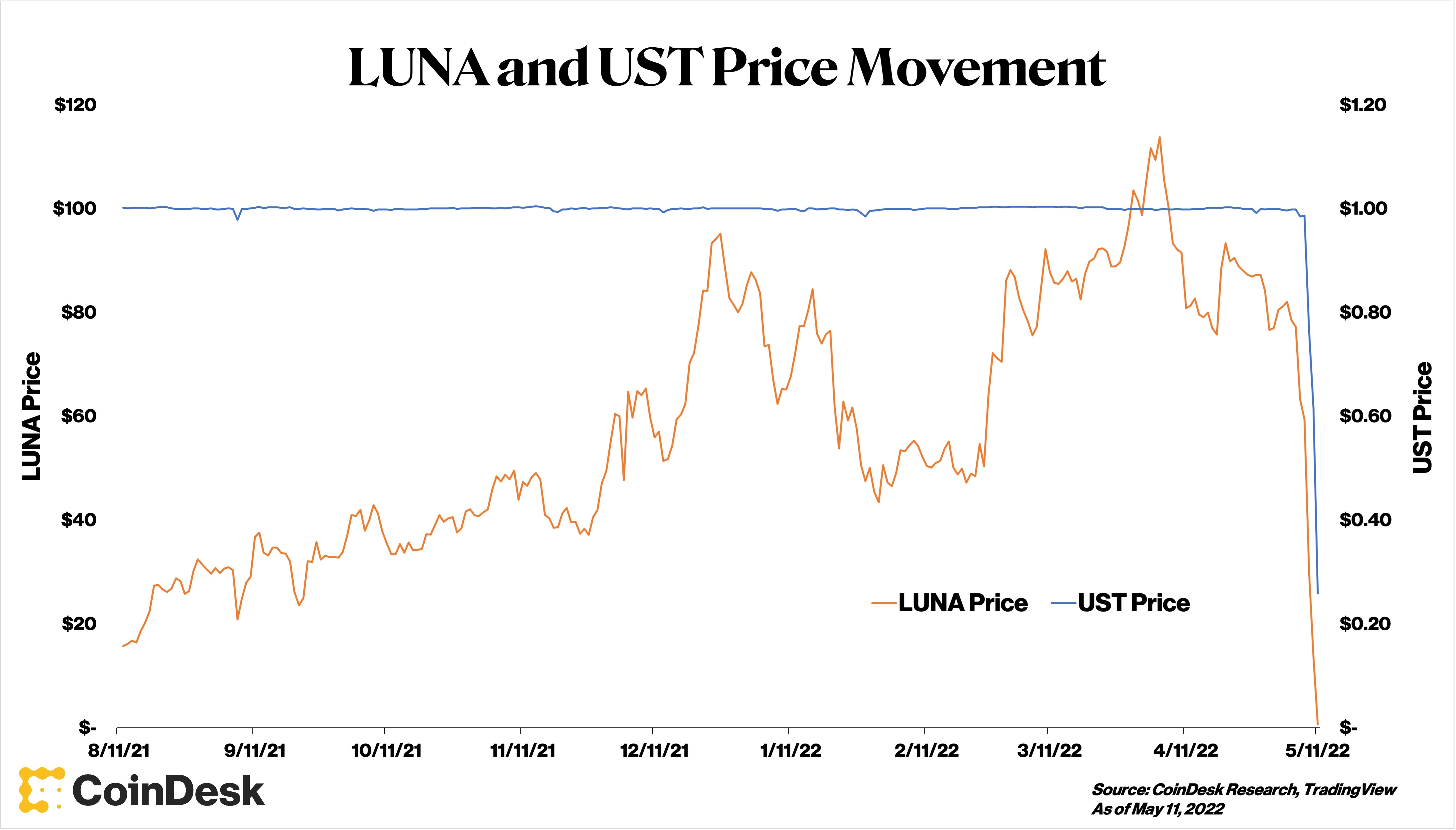 The Terra money machine collapsed almost entirely today. The UST stablecoin remains deep in the sub-dollar doldrums for the third day running, and LUNA, its sister token, has fallen almost 97% off its 2022 high. The near-complete failure of a darling of decentralized finance (DeFi) stands as an important lesson in the systemic risks of algorithmic stablecoins – crypto’s elusive holy grail.