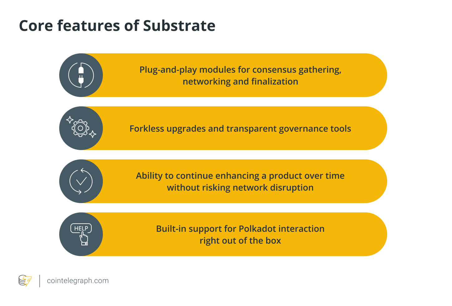 Substrate also provides developers with a library of modules that can be used to create compatibility between new blockchains and legacy chains such as Bitcoin and Ethereum. What's more, you don't even need to create blockchains that connect to Polkadot while using Substrate. Simply put, any developer can use Substrate to create forkless blockchains that can upgrade without the need for hard forks and on any ecosystem outside Polkadot or Ethereum.