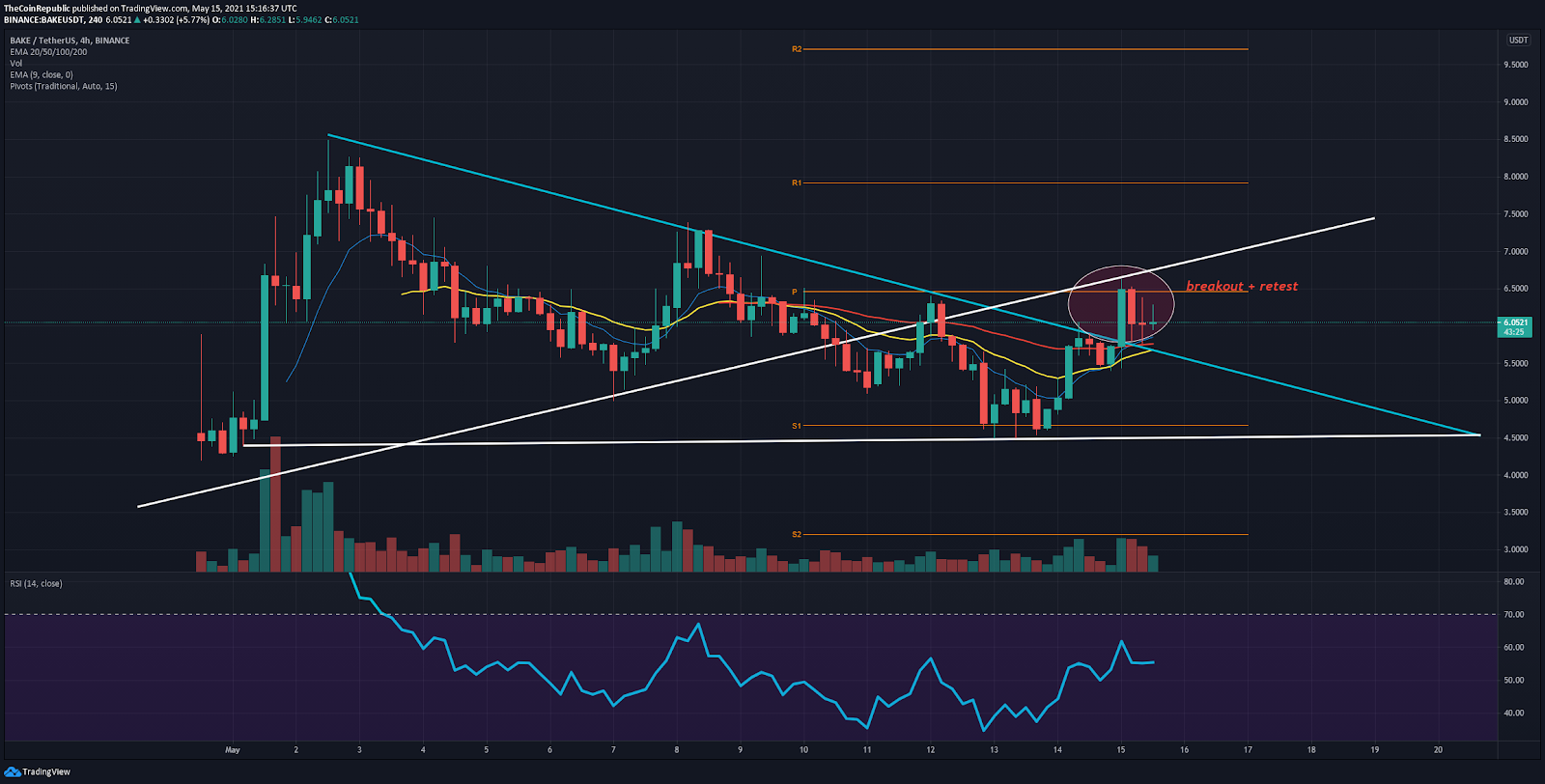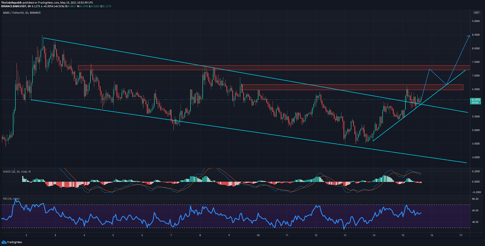 - BAKE/USDT bounced from a low of $5.40 to a high of $6.50 in Saturday’s intraday session