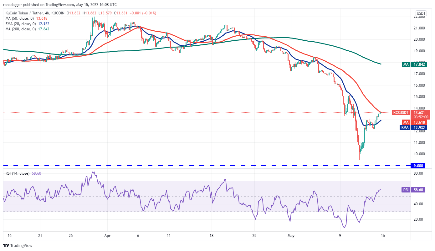 The KCS/USDT pair could next rise to the 50% retracement level at $14.95 and later rally to the critical overhead resistance at the 20-day EMA ($15.45). This is an important level to keep an eye on because a break above it could signal that the downtrend may have ended.