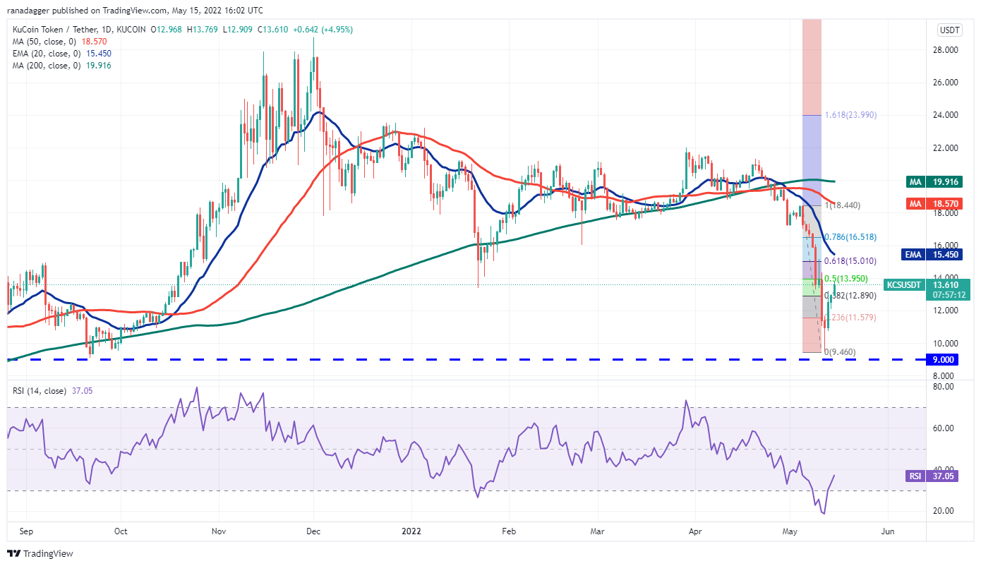 KuCoin Token (KCS) rebounded sharply off the strong support at $9 on May 12. The relief rally has risen above the first hurdle at the 38.2% Fibonacci retracement level at $12.89, which is a mild positive.