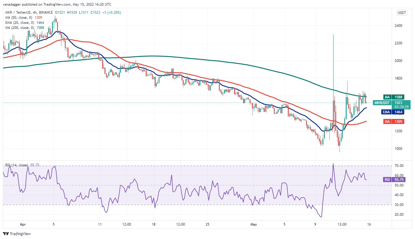 Maker (MKR) bounced off the psychological support at $1,000 on May 12 indicating that bulls are defending this level with all their might. The bulls pushed the price to the 50-day SMA ($1,754) on May 13 but the long wick on the day’s candlestick shows strong selling at higher levels.