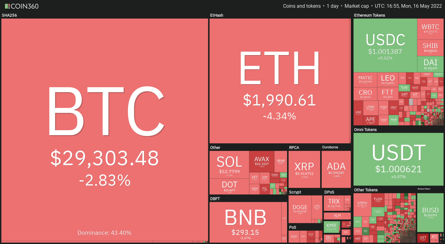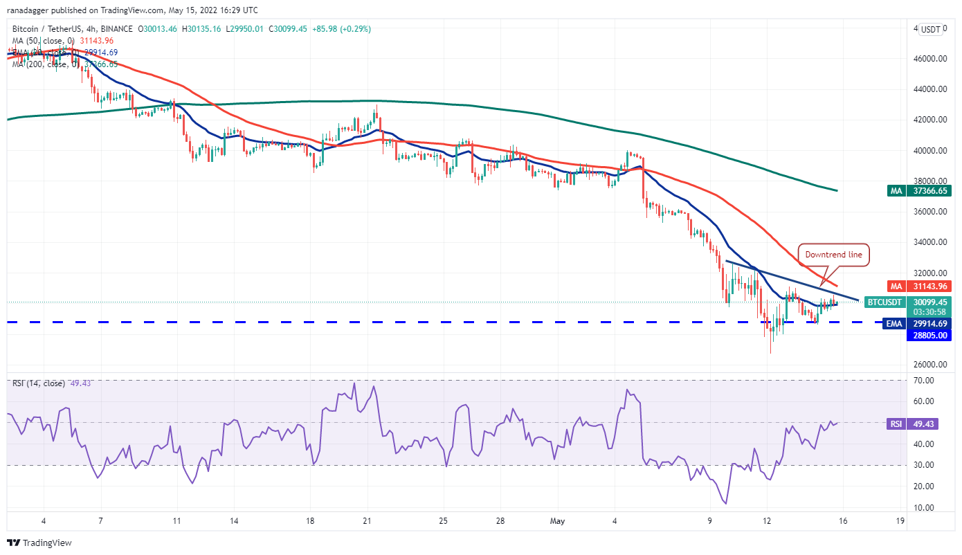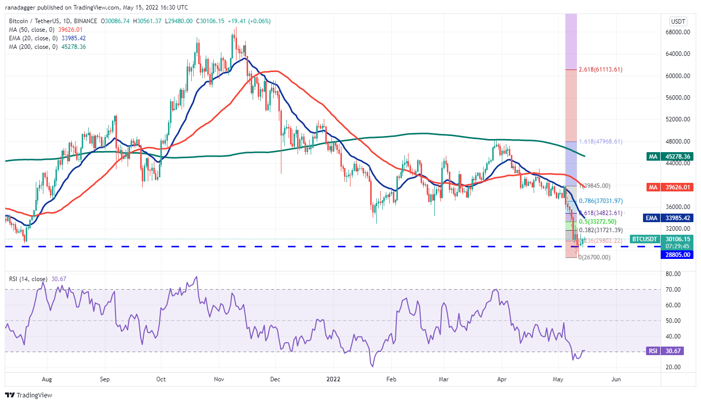 Bitcoin attempted a strong bounce on May 13 but the long wick on the day’s candlestick suggests that bears are in no mood to let go of their advantage. However, a minor positive is that the bears have not been able to sustain the price below the crucial support at $28,805.