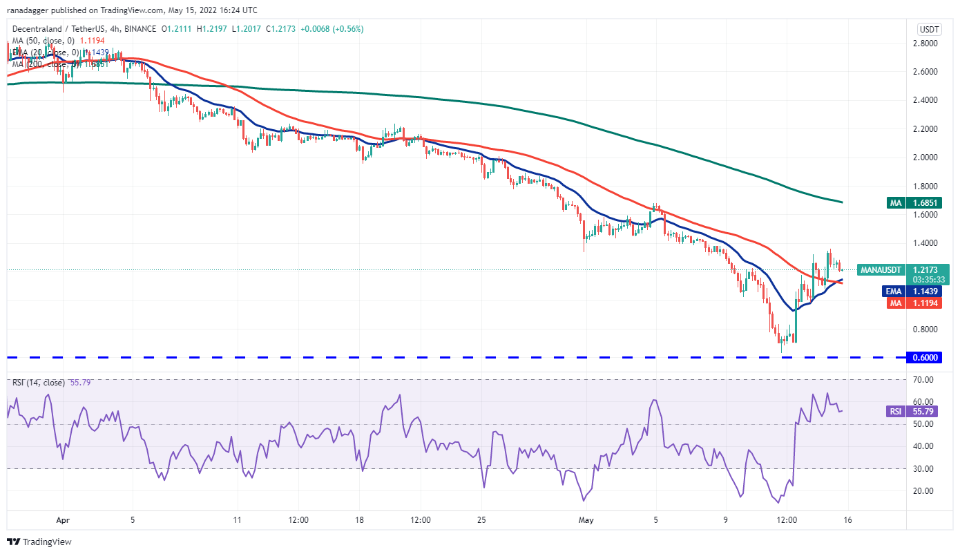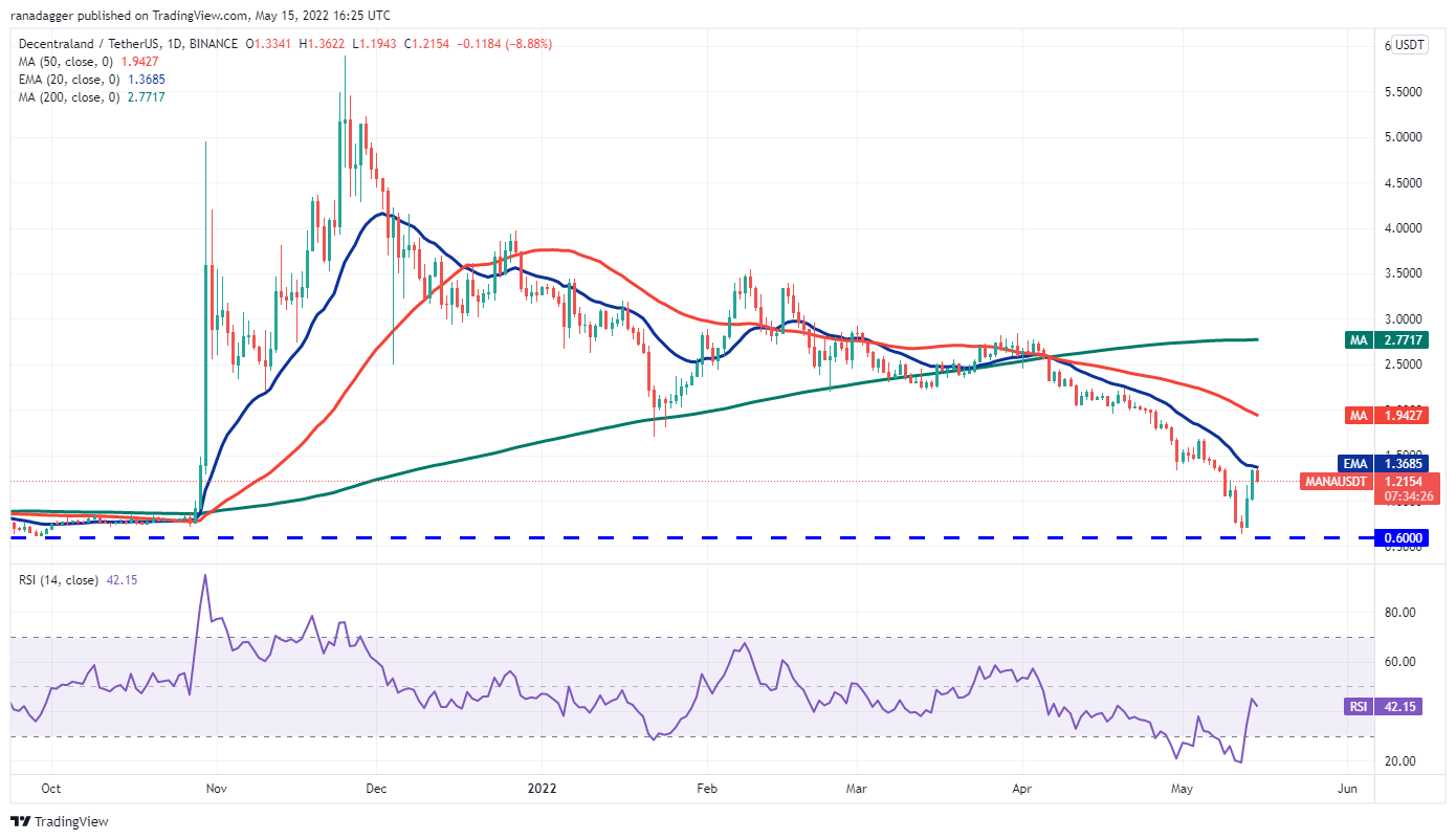 Decentraland (MANA) has been in a strong downtrend for the past several days. The bulls aggressively defended the decline to $0.60 on May 12 resulting in a recovery to the 20-day EMA ($1.36).