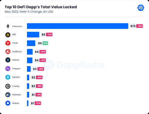 In particular, Ethereum’s (ETH) total value locked in DeFi shrank by 35% in May to $73 billion amid the bearish market sentiment around Terra’s crash, according to data from a DappRadar report shared with Finbold on June 8.