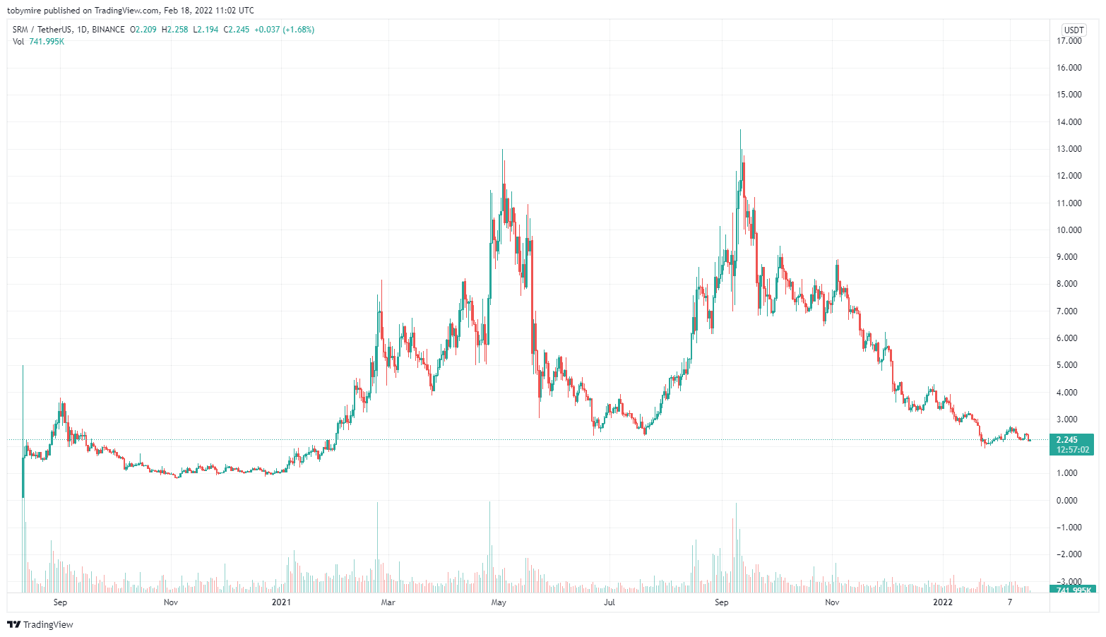 At the turn of the new year, SRM trended with the cryptocurrency market boom of 2021 that saw mainstream assets like BTC and ETH attain new heights. On February 10, $SRM exceeded its previous high and attained a new high of $4.42. The bullish run continued for the next few months, and by May 03, 2021, SRM’s price had gained over 190% to reach $12.89. The bears soon took over, but the token regained momentum to attain its all-time high at $13.72 on September 11. Also, its 24-hour trading volume peaked at $2,347,324,861.