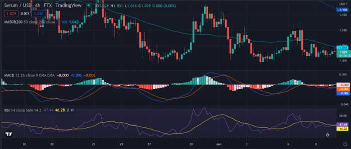 Serum price analysis shows the SRM/USD pair has been on a bearish trend over the past few weeks. The price is currently trading around $1.04, which is well below the recent high of $1.22. The Relative Strength Index (RSI) is currently at 46, indicating that the market is neither overbought nor oversold. However, the MACD shows that the pair is in a bearish trend as the MACD line is below the signal line.