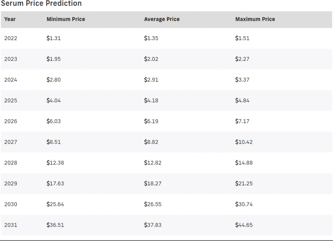 The 5-year Serum price prediction by Technews leader is that the price can go as high as $2.79 by the year’s end, with an average price of around $2.45. They also believe that in 2025, the price of Serum can rise to as much as $6.54.