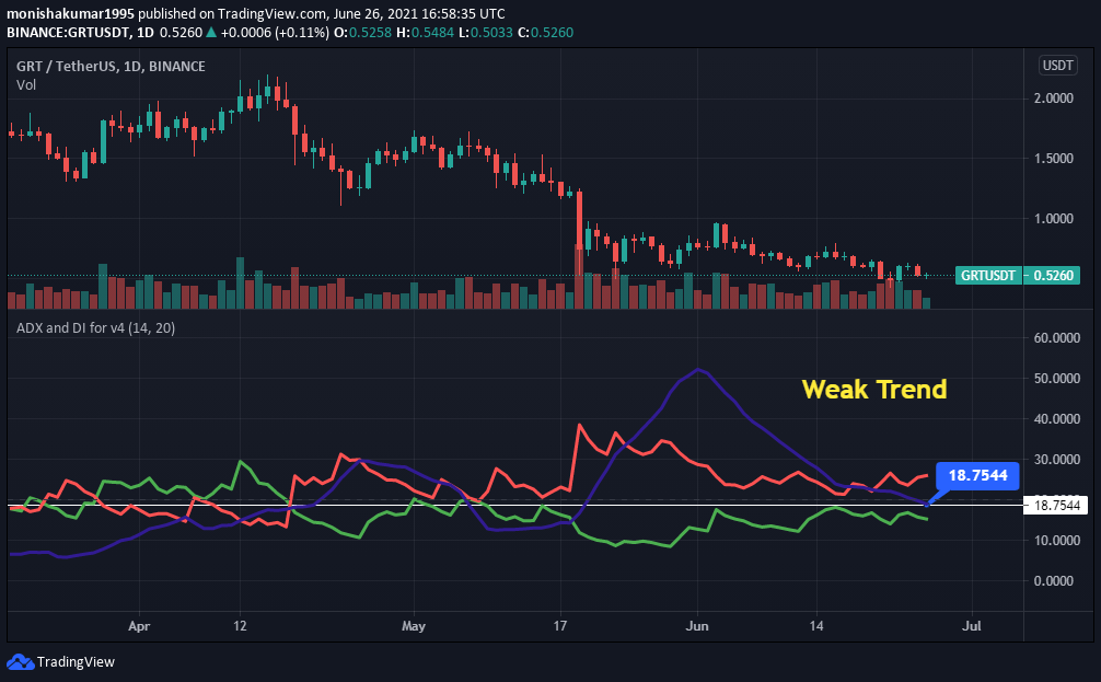 The above chart shows the ADX of GRT stays above the range of 18, so it indicates a weak trend.